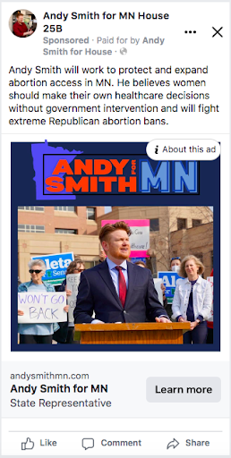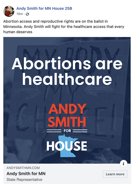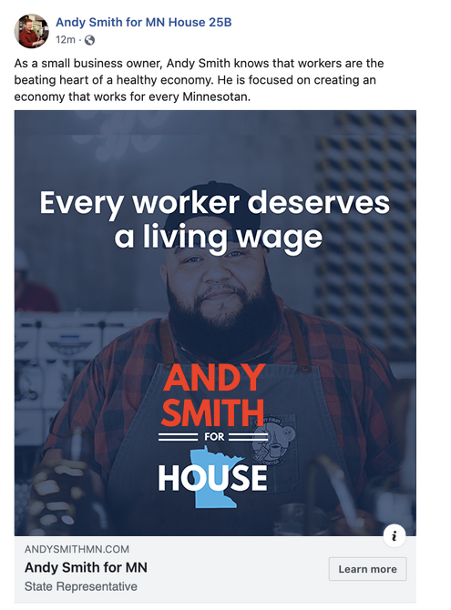 Andy Smith won his seat in the Minnesota House of Representatives. The Facebook ads I created got over 500,000 impressions and a reach of over 64,000 people.